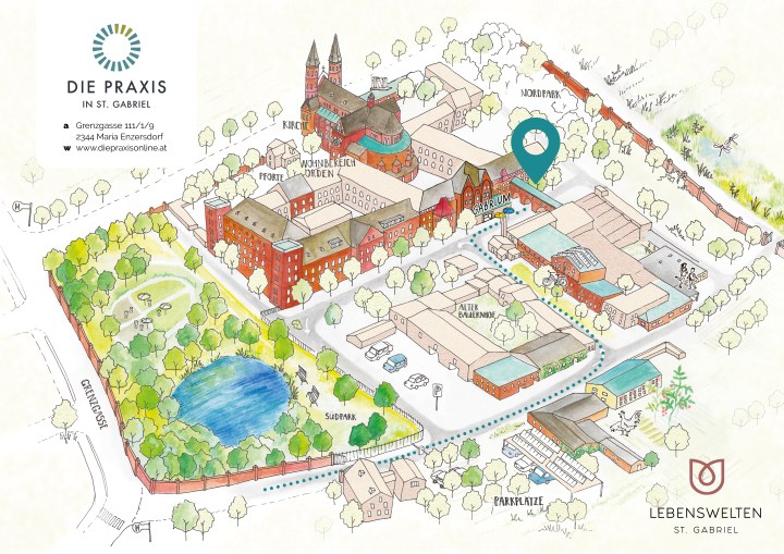 A2 von Wien oder Graz kommend: Ausfahrt Mödling, bei der Ampel links auf B17/Triesterstraße abbiegen, an der nächsten Kreuzung nach rechts Richtung Mödling abbiegen. Folgen Sie dem Wegweiser „Lebenswelten St. Gabriel“. Der Wienerstraße über die Ampel bis zum Kreisverkehr folgen. Im Kreisverkehr die erste Ausfahrt in die Grenzgasse nehmen, nach 700m erreichen Sie die Grenzgasse 111 (Lebenswelten St. Gabriel). Biegen Sie hier rechts in das Kloster-Areal ab. Fahren Sie durch den Schranken und folgen Sie der Beschilderung „DIE PRAXIS in St. Gabriel“.